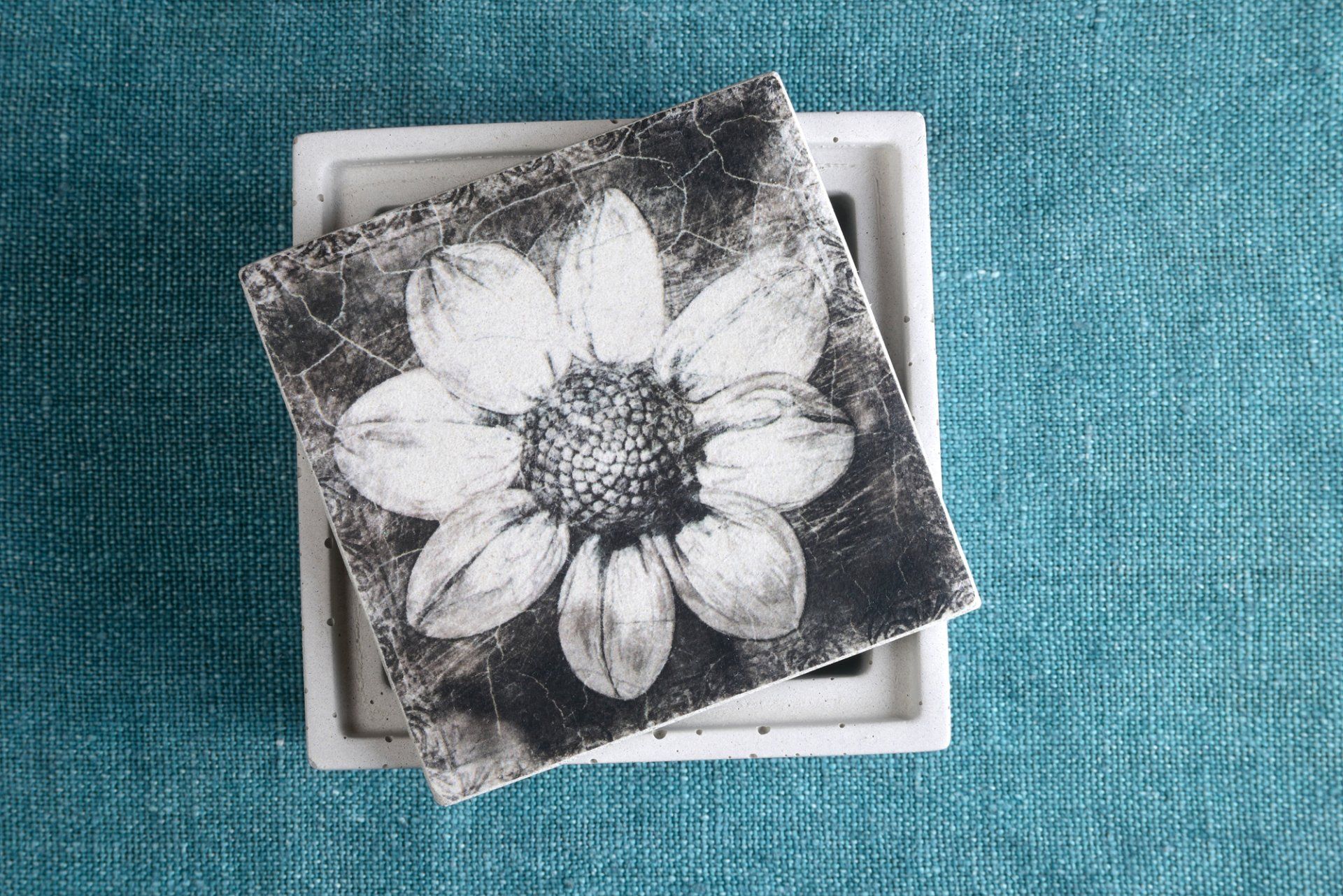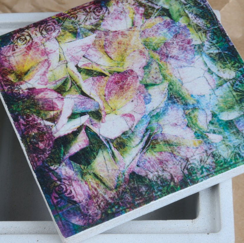 Den virtuellen Raum ab und zu verlassen tut gut. Ich habe als Ausgleich zur Arbeit am Rechner eine Möglichkeit gesucht, entstandene Grafiken auch handwerklich umzusetzen. Experimentell entwickelte ich eine Technik, mit der sich Bilder auf Beton übertragen lassen. Daraus wurde eine Reihe schöner Dinge, die auch erworben werden können.